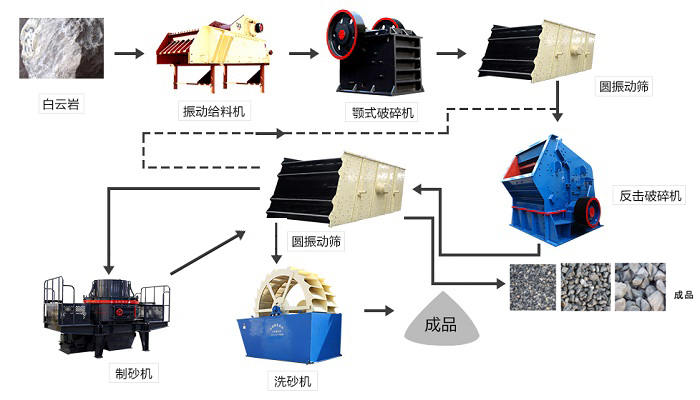 白云岩破碎生产线流程通常需要经过粗碎、细碎、筛分这三道工序,其具体流程如下: