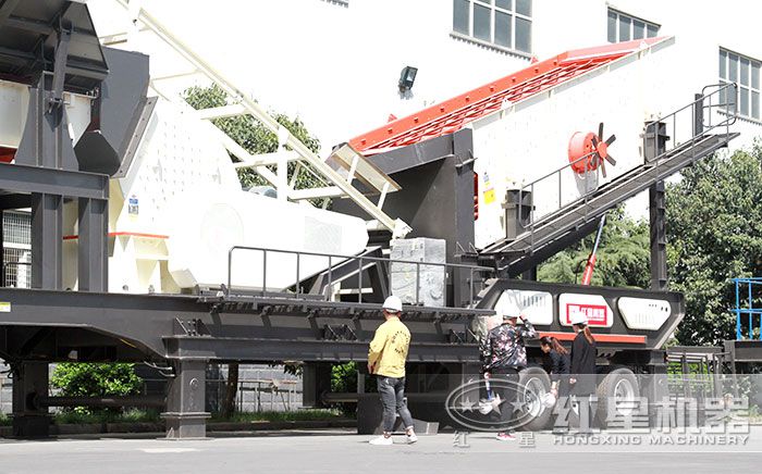 将锤破安装在轮胎半挂车上那就可以组成一个可随时移动的破碎机了,再安装上一个给料机或者筛分机就是一体化的破碎筛分设备了,移动起来很方便,可以直接开到作业场地,还有远程操控系统,一个人便可操作整条生产线。如下图所示。