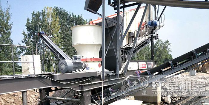 某项目现场,移动鹅卵石粉碎机作业中,费用在65万左右