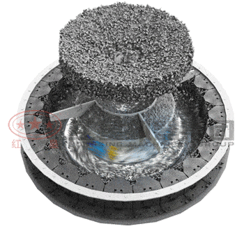 冲击式破碎机在工作时,通过破碎腔内叶轮的高速旋转对经由甩料盘甩出的物料进行充分的冲击作用,受冲击力的物料改变运动方向向破碎腔内壁分散,撞击在反击板上实现二度破碎,在反击板的阻挡作用下物料斜向下运动,在向下部运动中又与不断被高速旋转的叶轮击打出的物料产生相互撞击,实现物料之间的“自击”破碎,在叶轮高速旋转形成的涡动腔内又与物料产生相互冲撞,逐渐破碎至需要粒度后由出料口排出。在冲击式破碎机的整个破碎过程中,所破碎的物料不与破碎腔内的设备机械零部件产生直接碰撞接触,而是通过物料直接的相互冲击作用力传递实现细碎生产,因此,设备利用率高,物料受力充分,击打程度上降低了设备消耗,生产过程节能高能,生产效率高。采用特别的自击式原理进行不同质量物料的破碎,是冲击式破碎机实现节能生产的关键。